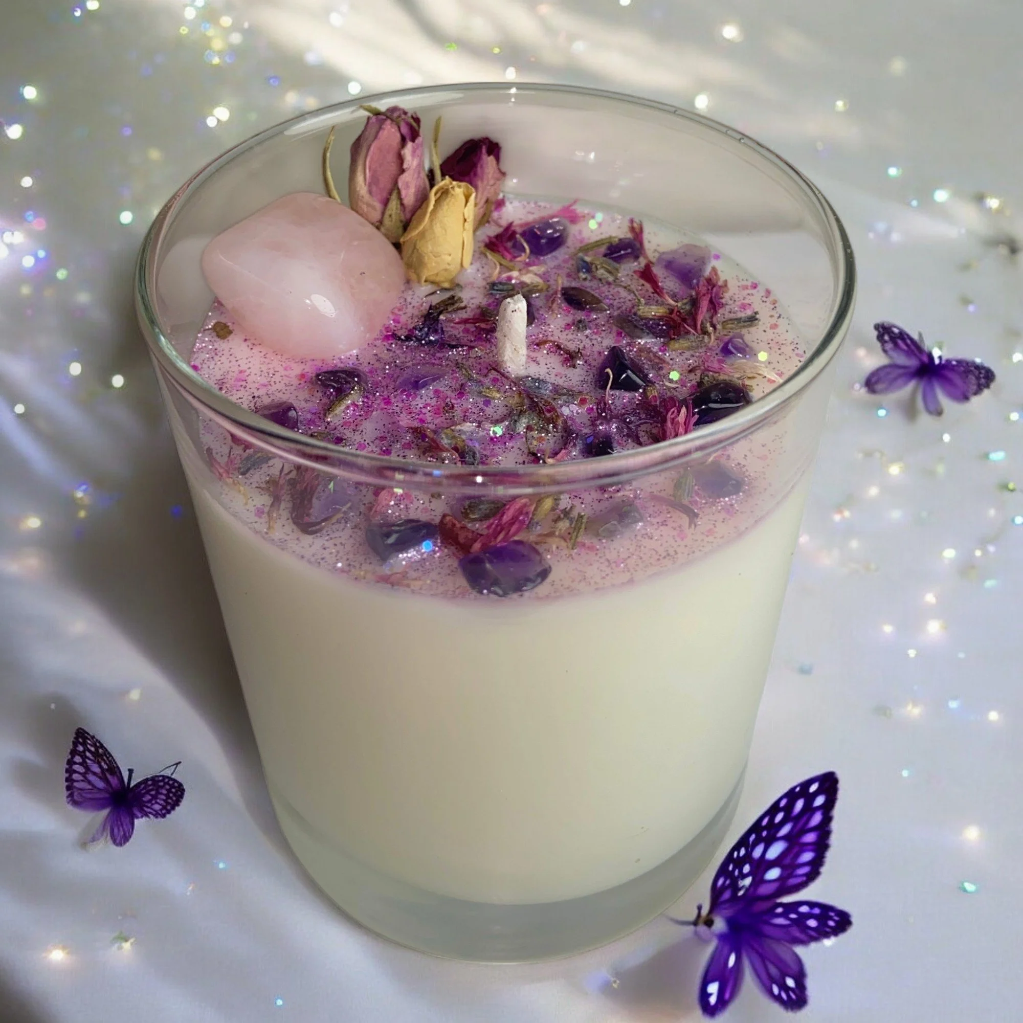 Our candles are hand-poured with love & care, using 100% soy wax to ensure a clean and eco-friendly burn. We believe in providing a mindful experience and that's why all crystals used are ethically sourced, cleansed and charged with intention. All of our candles are free from parabens, CMRs & phthalates and all glitters used are biodegradable.