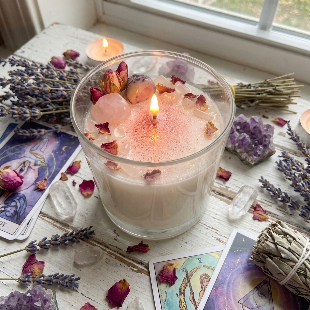 - If your candle contains large crystals or florals, remove them before lighting or within 10 minutes of burning to prevent uneven burning. Make sure no florals are close to the flame. You can wash the crystals in warm, soapy water.